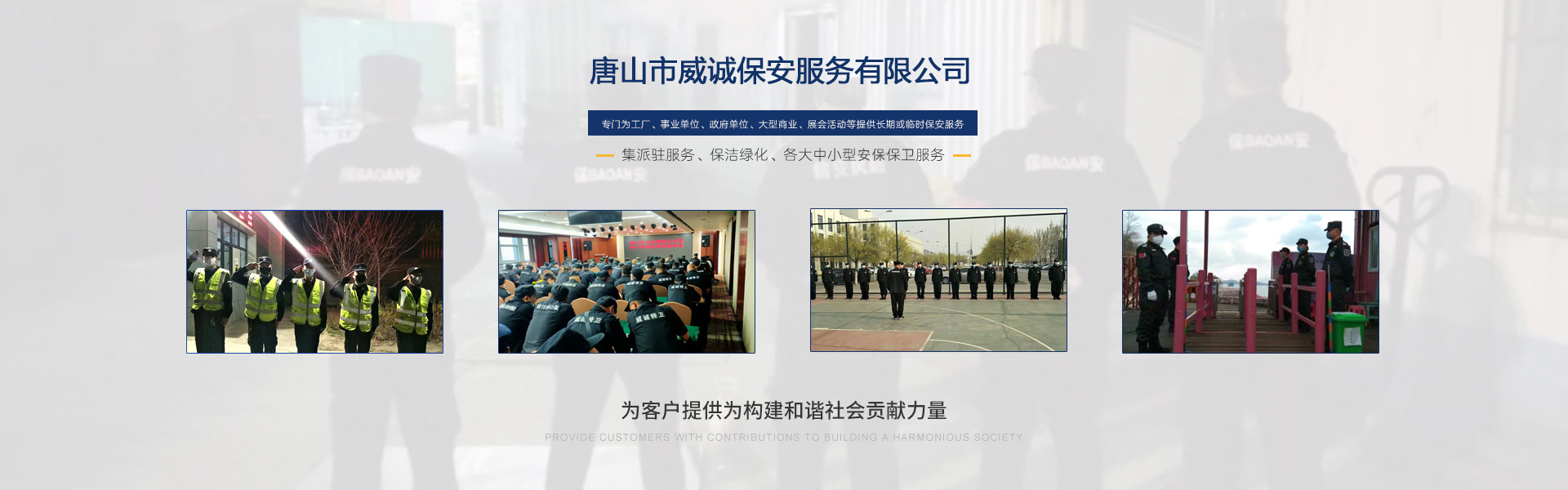 唐山市威誠保安服務(wù)有限公司自成立以來以“嚴(yán)防死守、忠于業(yè)主”為服務(wù)原則,以“客戶滿意、 合作共贏”為根本目標(biāo)。以科學(xué)的管理、多方位多層次的服務(wù),建立了首問責(zé)任制,完善了走訪、回訪 、滿意度調(diào)查、末位淘汰的預(yù)警管理,不斷提高服務(wù)質(zhì)量,提高業(yè)主滿意度,提高企業(yè)形象。秉承“誠 實(shí)守信,紀(jì)律嚴(yán)明,團(tuán)結(jié)協(xié)作,致精致誠”的服務(wù)理念,為客戶提供高品質(zhì)、多方位、專業(yè)化的保安服務(wù)。 本公司制定了嚴(yán)謹(jǐn)?shù)亩ㄏ蛘猩徢芭嘤?xùn)、考核錄用、崗中培訓(xùn)、持續(xù)培訓(xùn)、末位淘汰制等一整套完善的管理體系。可以根據(jù)客戶的要求實(shí)地勘察評估,以量身定做的方式提供安保防范服務(wù)。